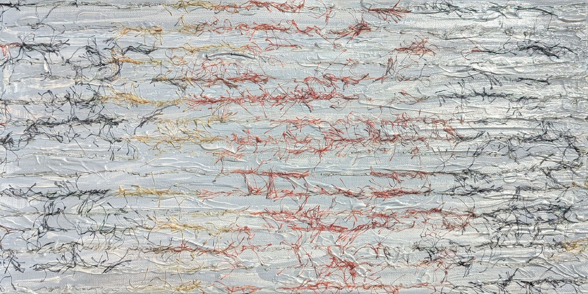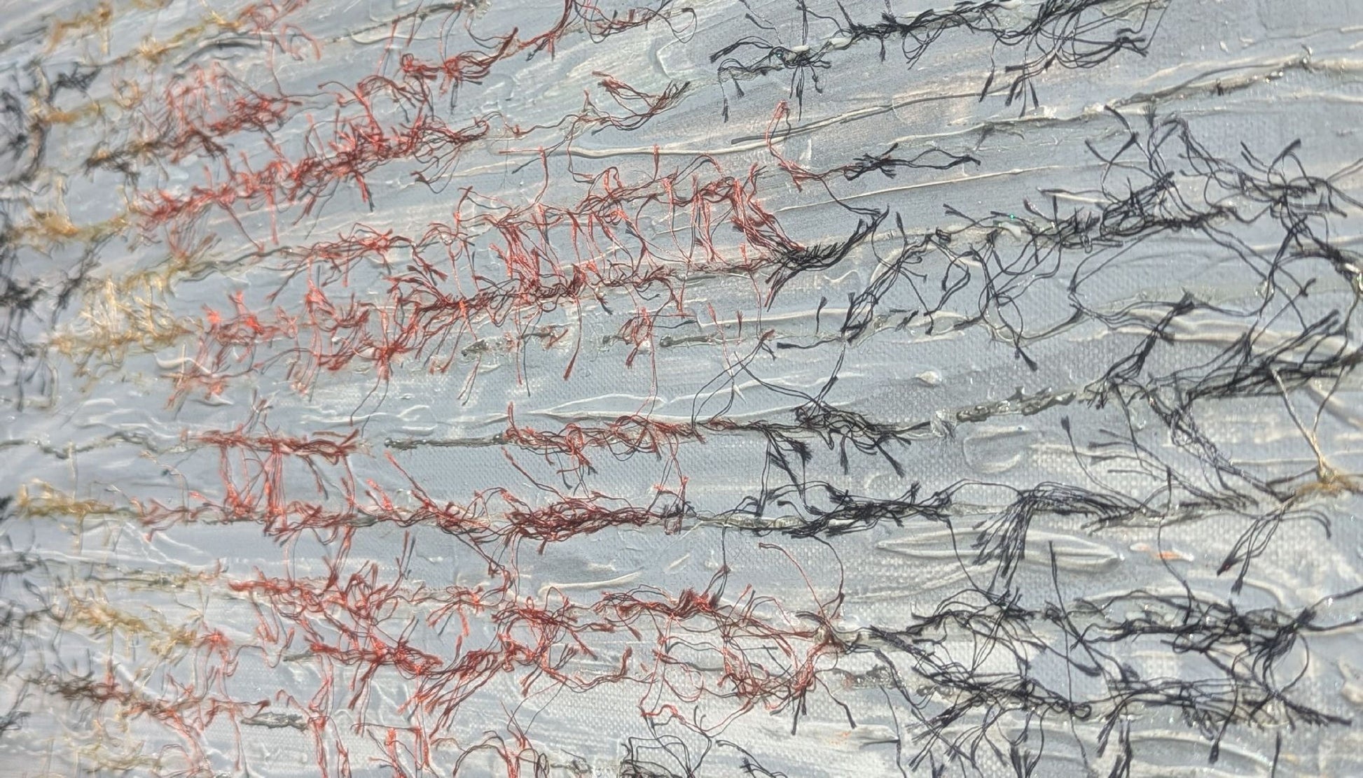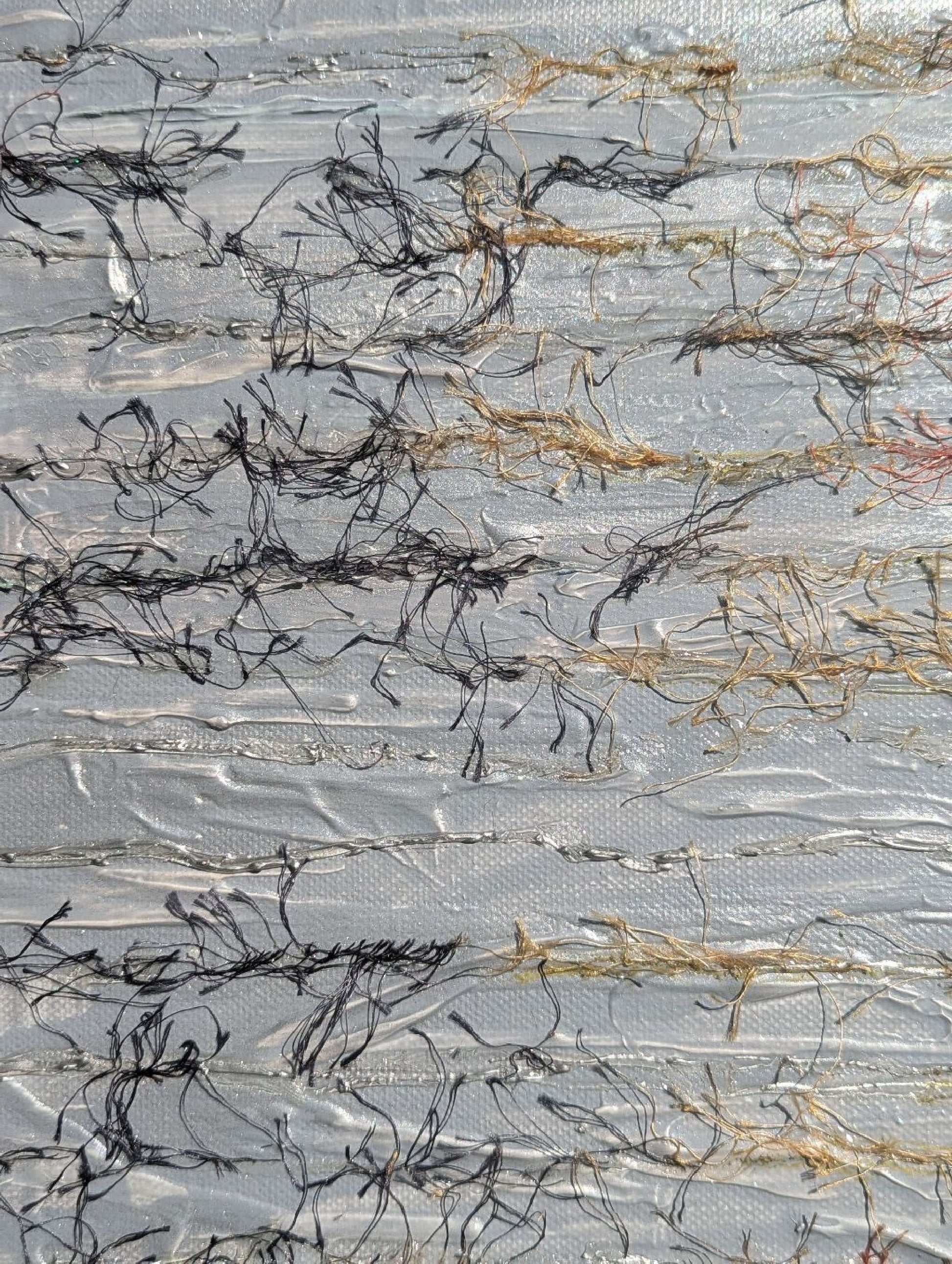mixed media painting on canvas (acrylic paint, gilding wax, wax pastel, glitter and re-used materials - yarn) 2024