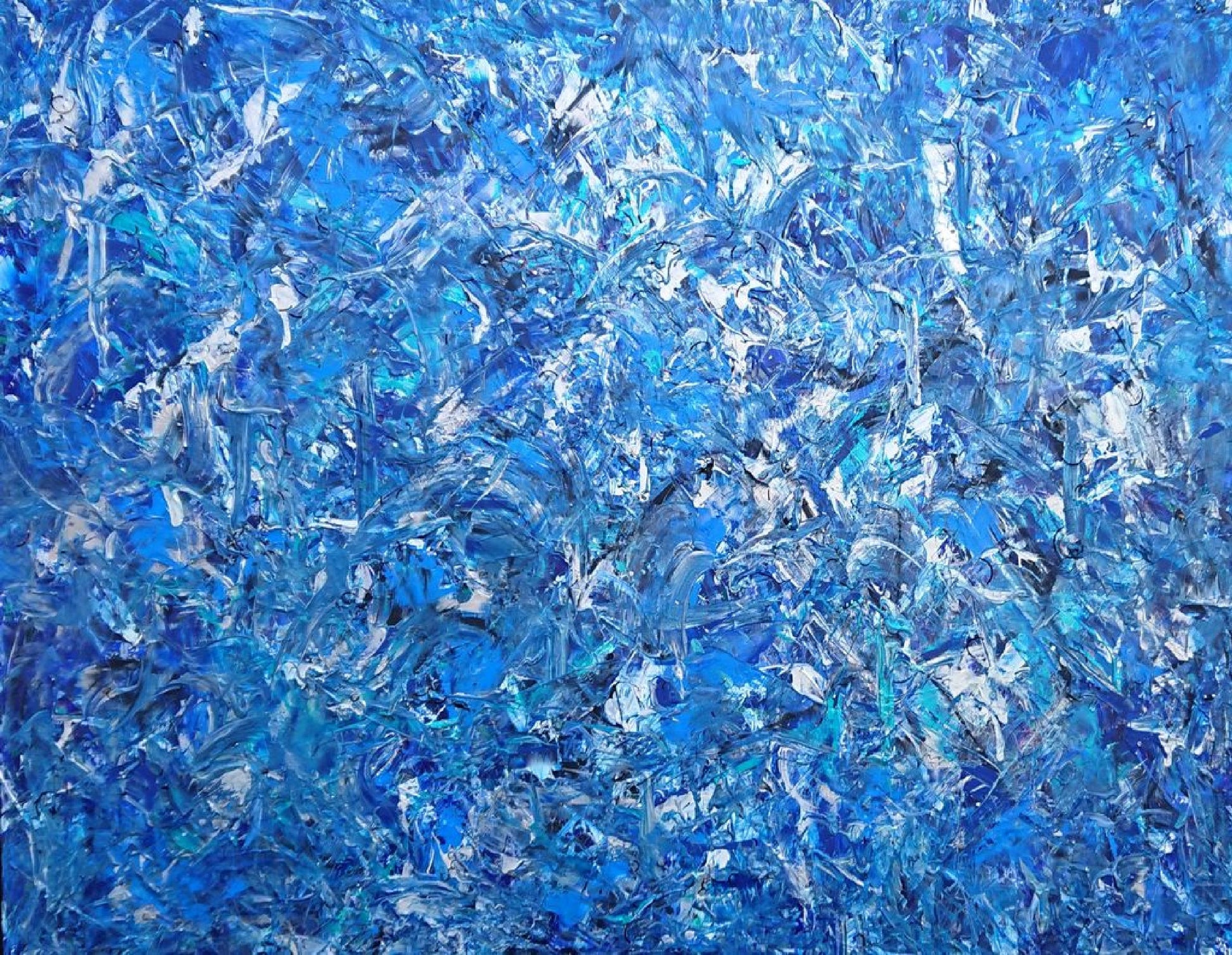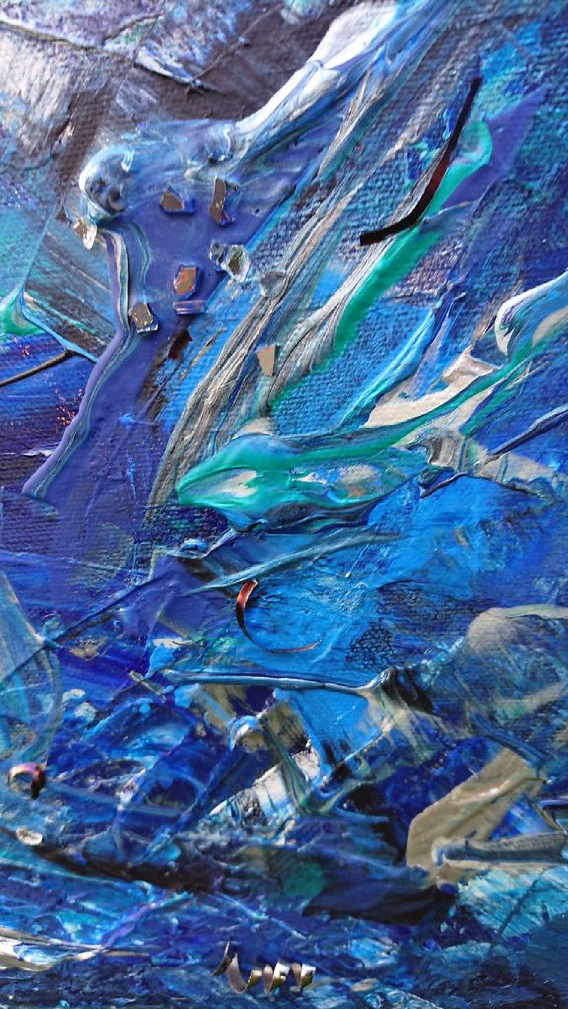 mixed media painting on canvas (acrylic and enamel paint, mediums, modelling paste, glitter, re-used materials - swarf and glass) 2019