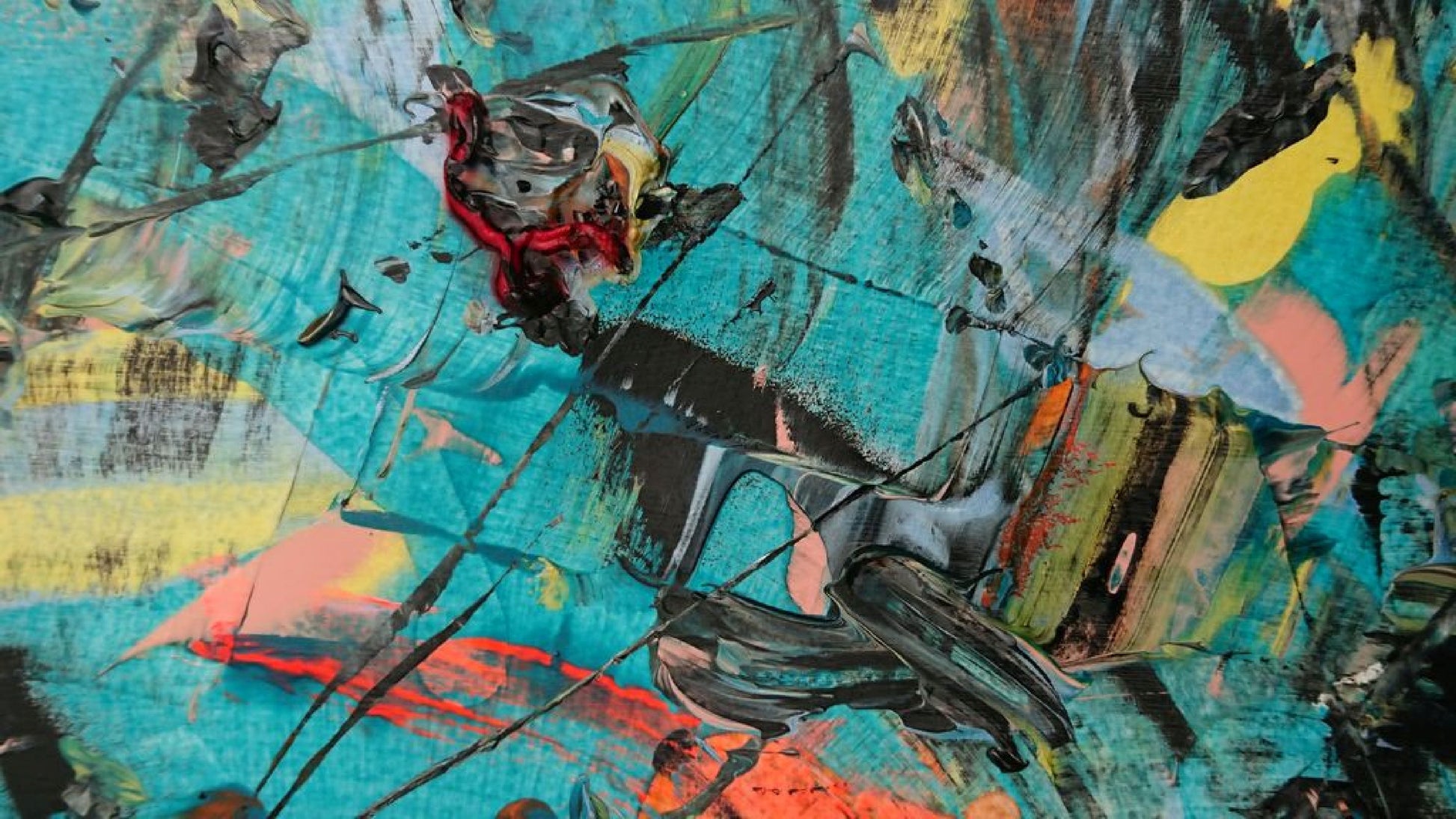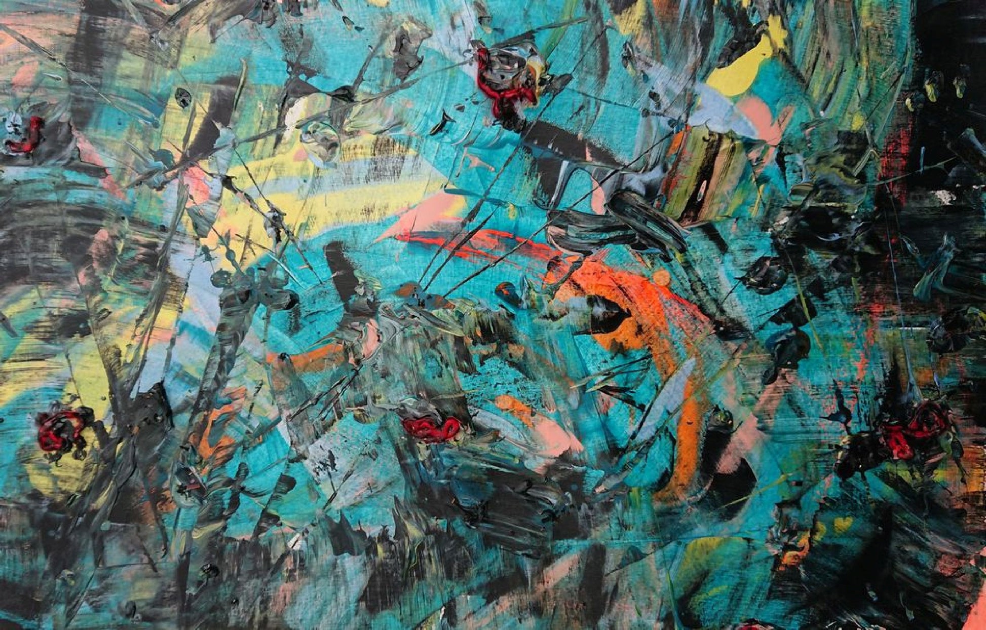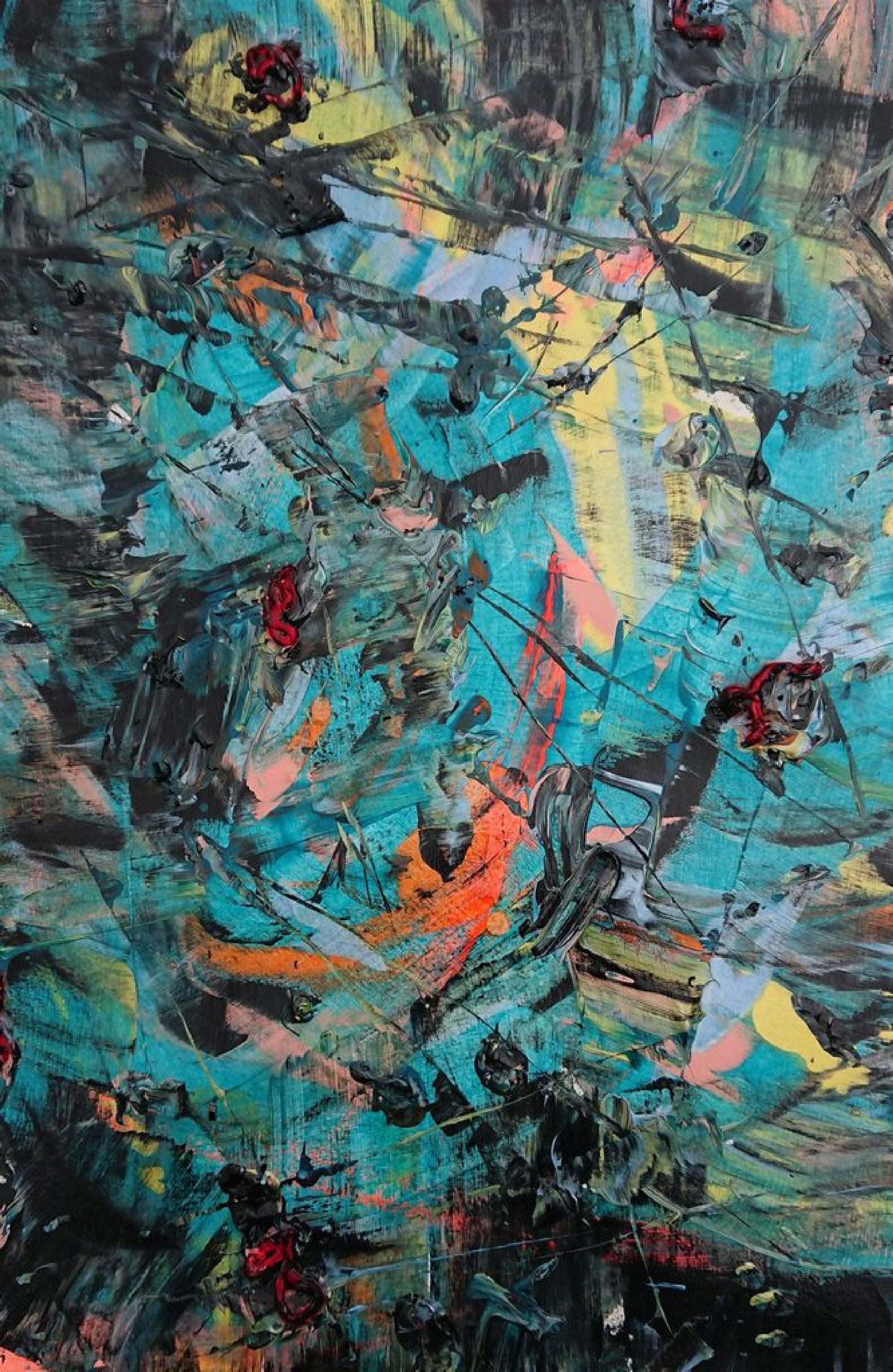 mixed media painting on 300gsm paper (acrylic paint and re-used materials - yarn, swarf) 2019