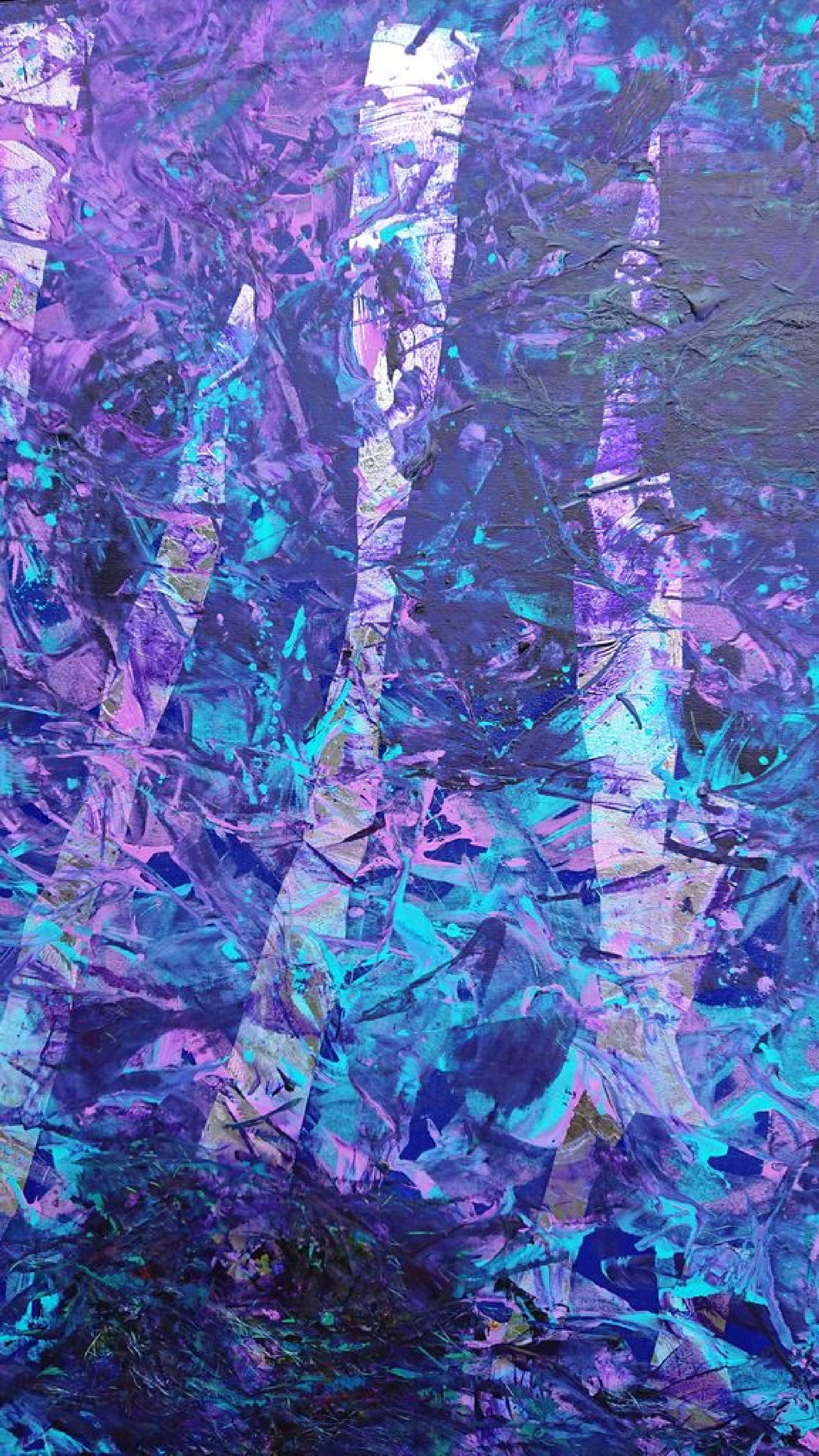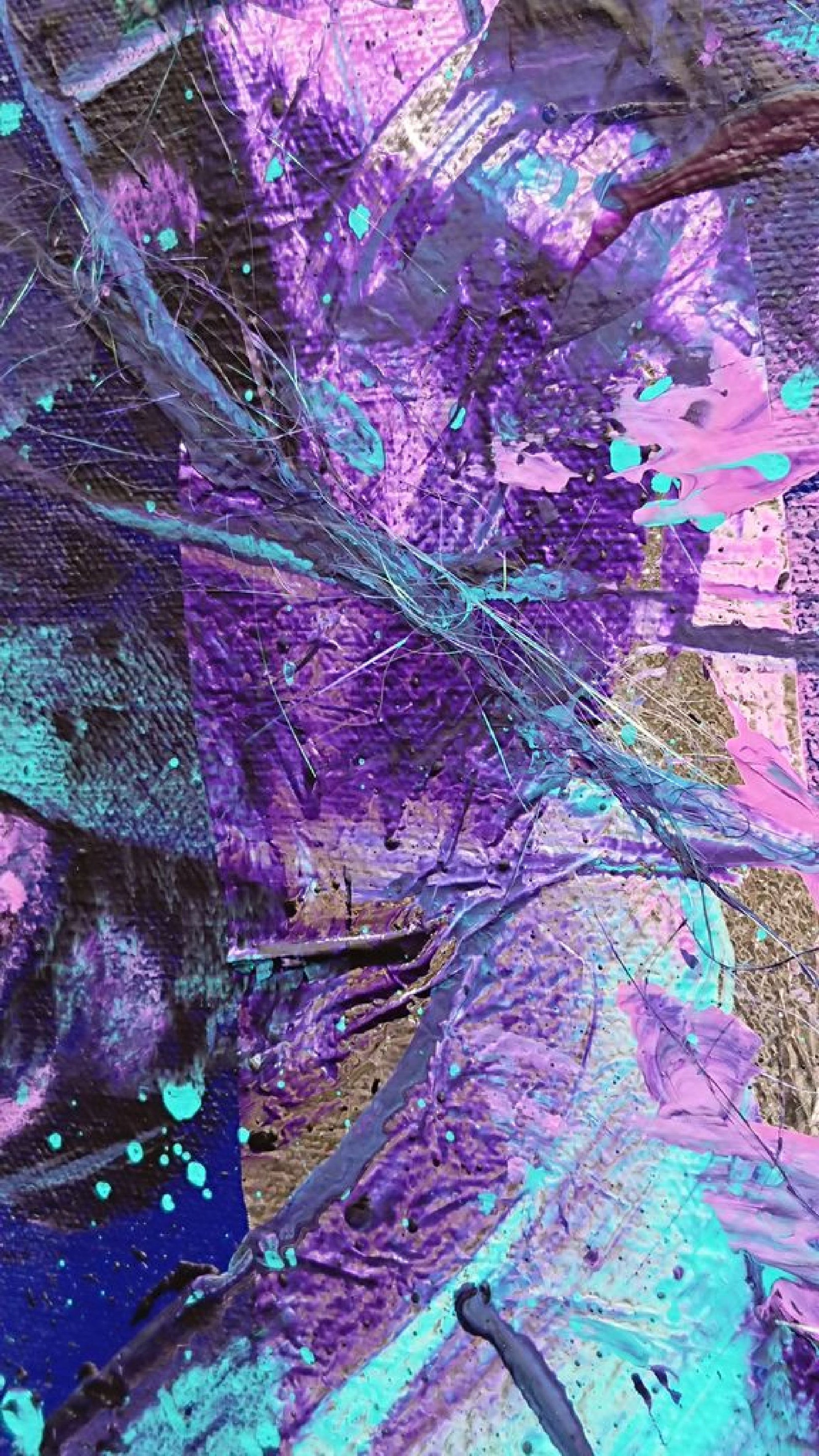 mixed media painting on canvas (acrylic paint, yarn and re-used materials - mylar sheet and velvet) 2021