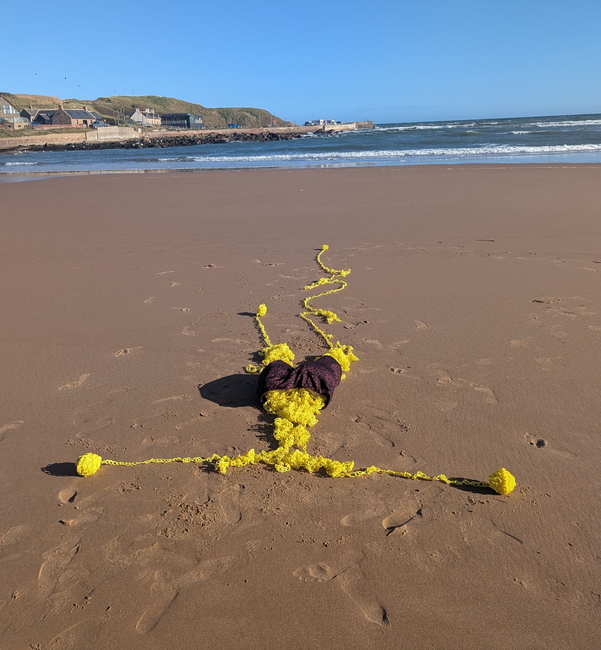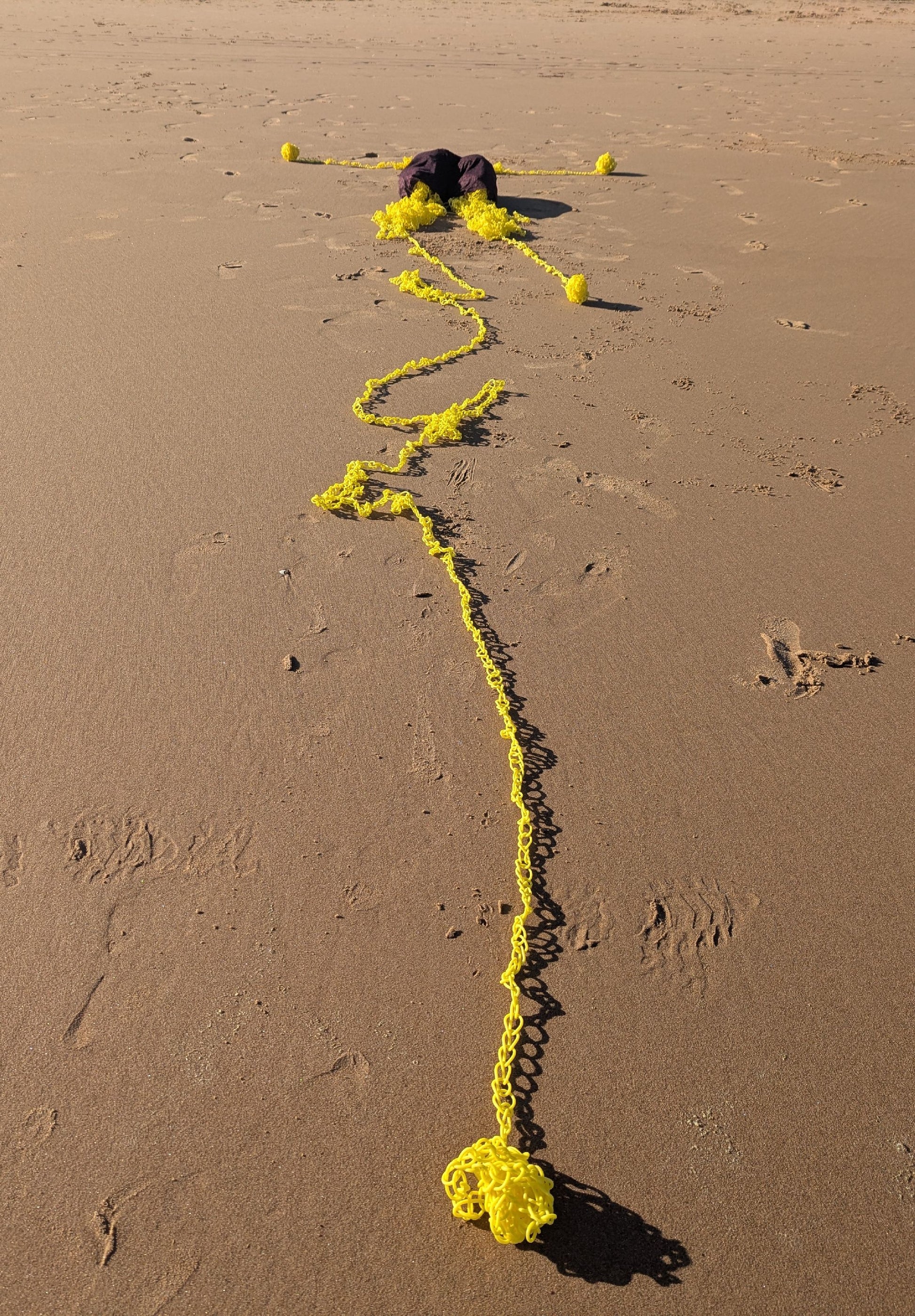mixed media installation: hand-chained silicone cord, hand chained found cotton string and re-used running tights; 2025 (Cruden Bay Beach, N E Scotland 8.9.25)