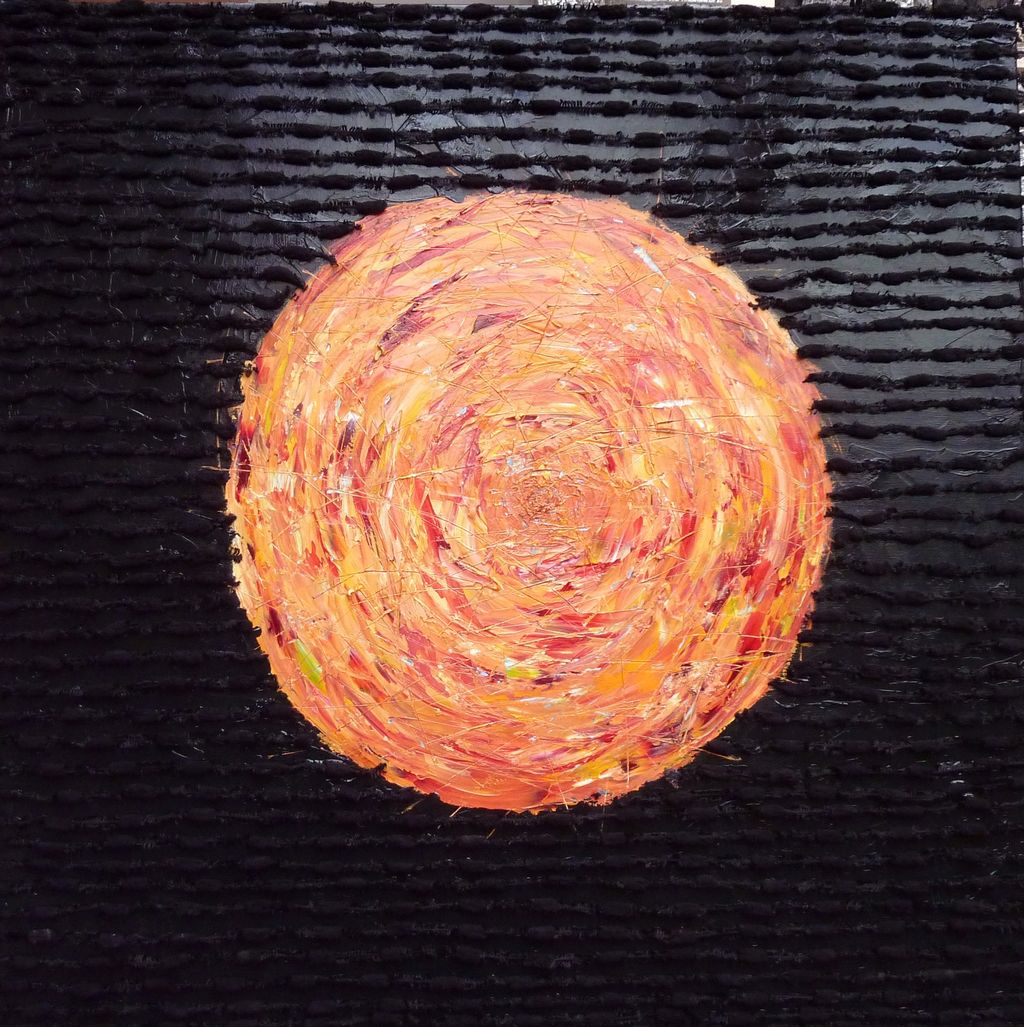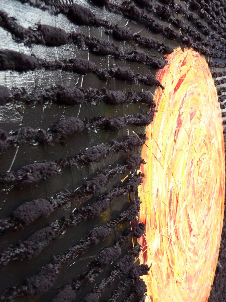 mixed media painting on canvas (acrylic paint, glitter and re-used materials - yarn); 2015