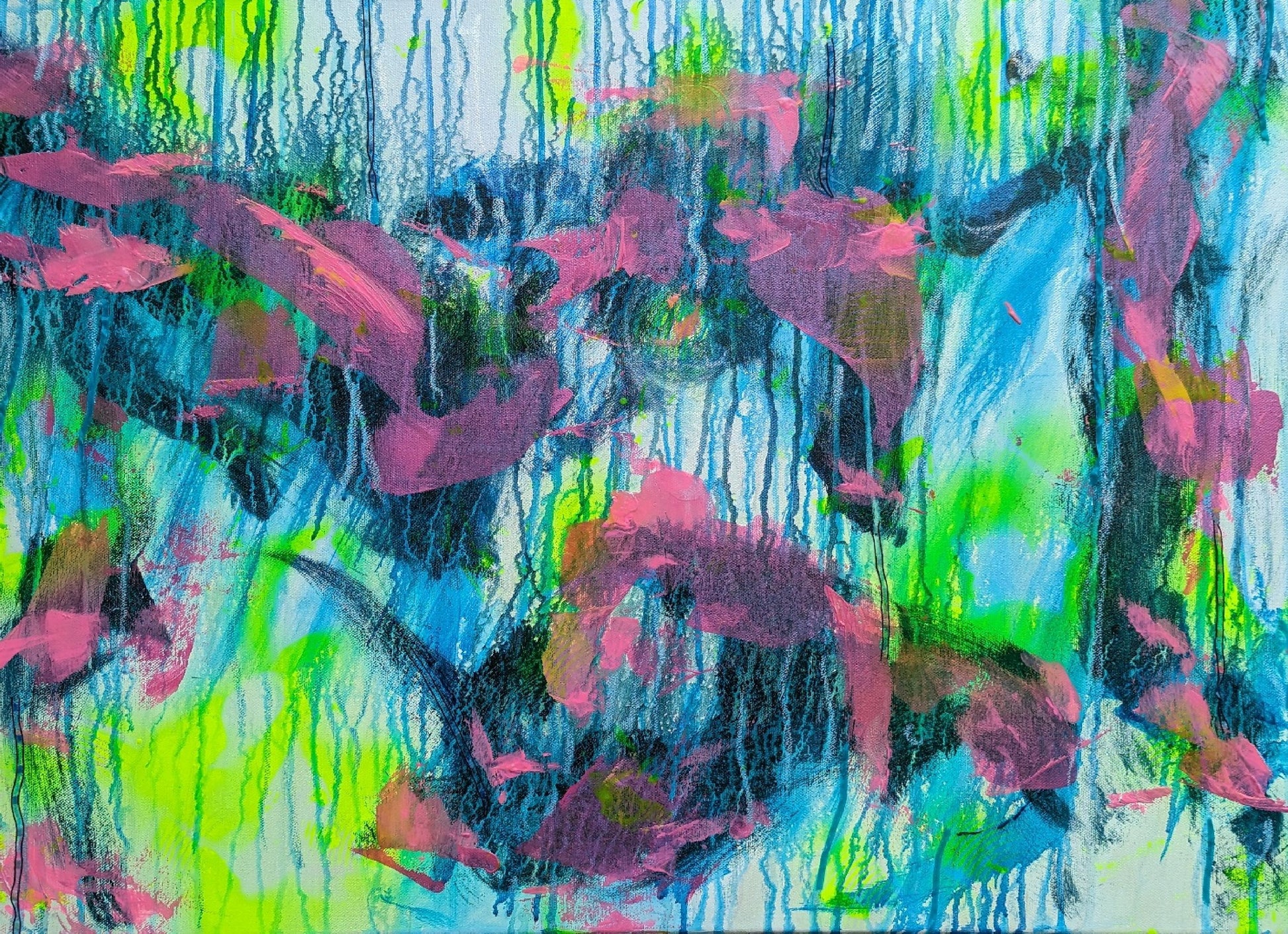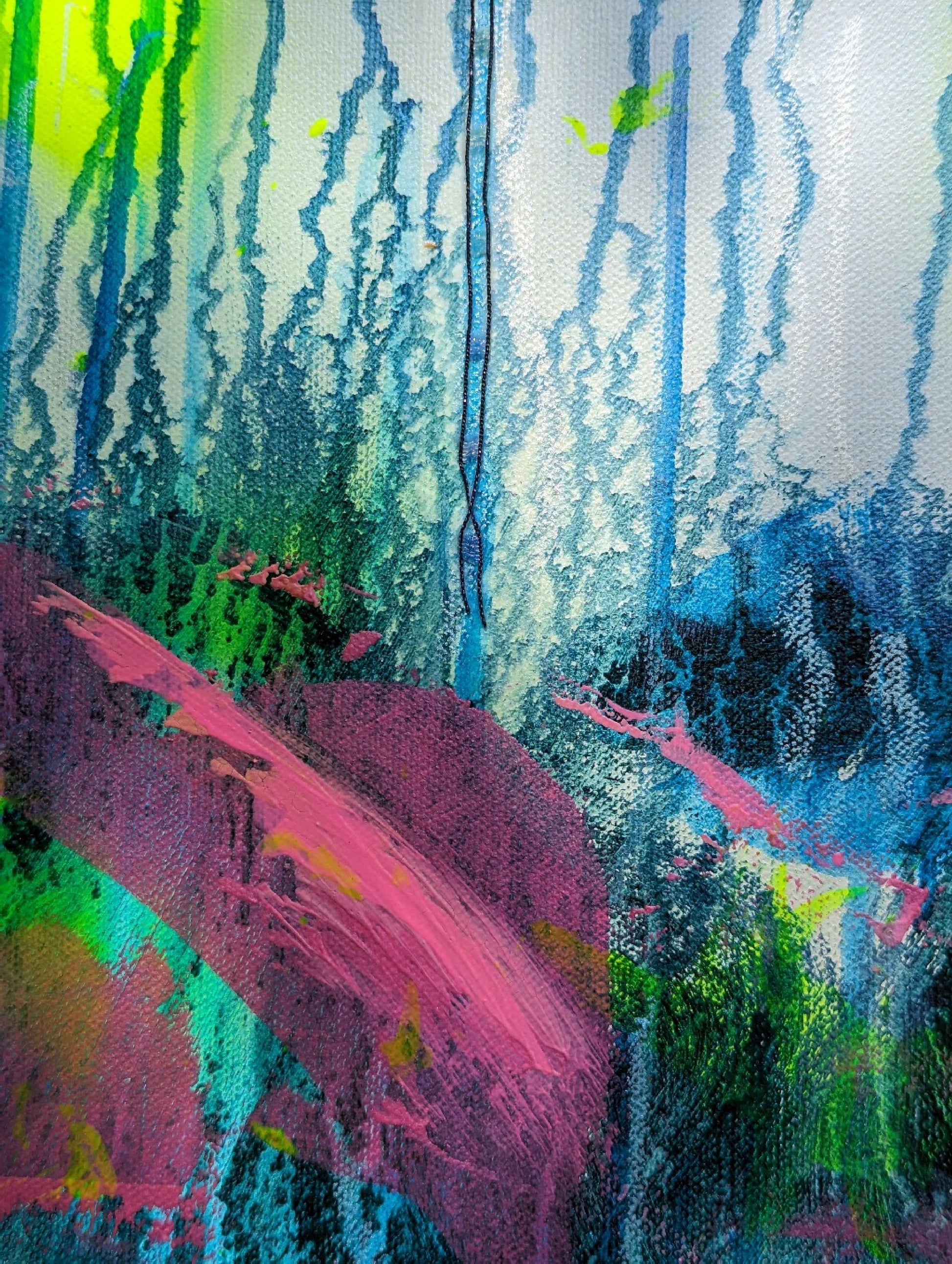 mixed media painting on canvas (acrylic paint and ink, oil pastel, yarn and re-used materials - ribbon); 2023