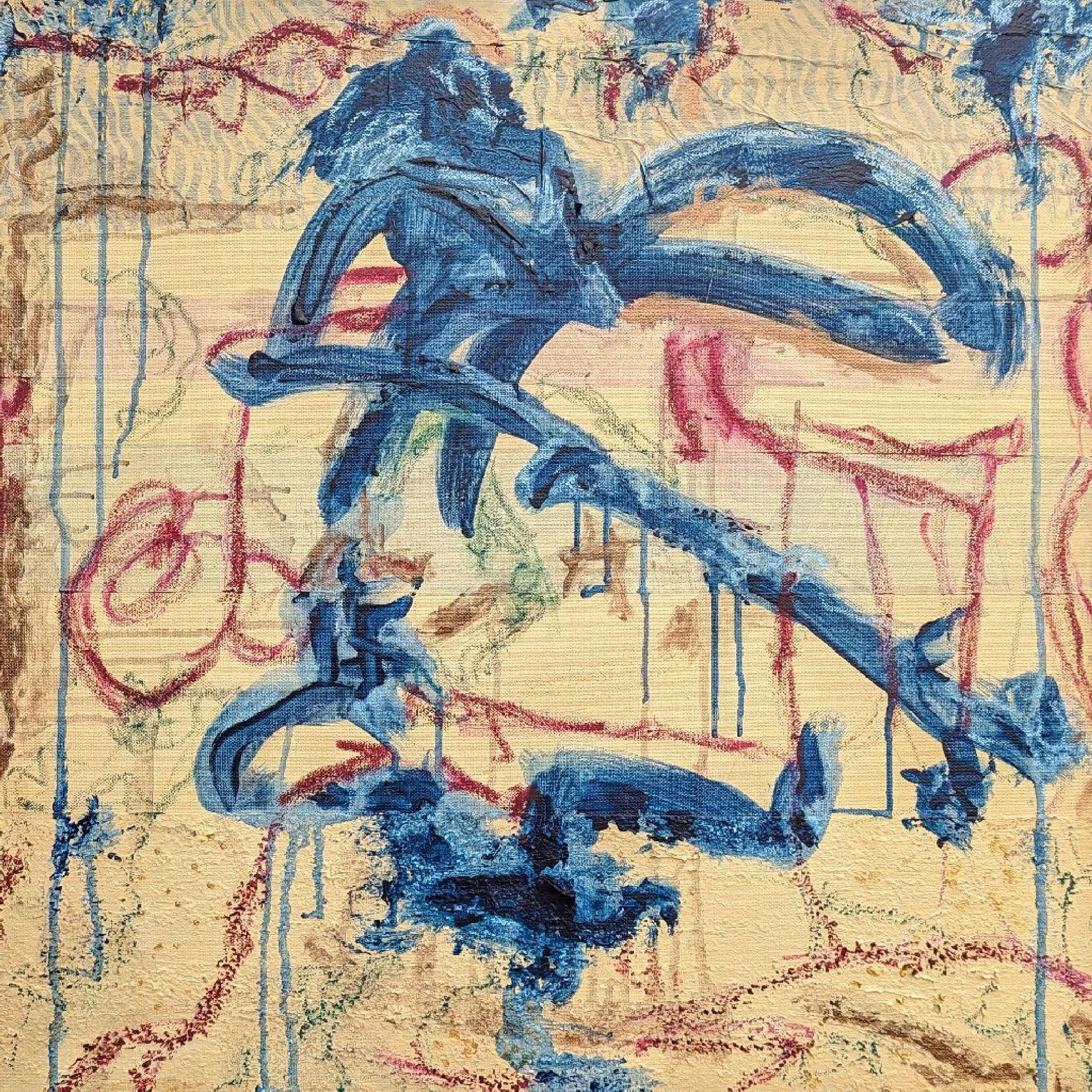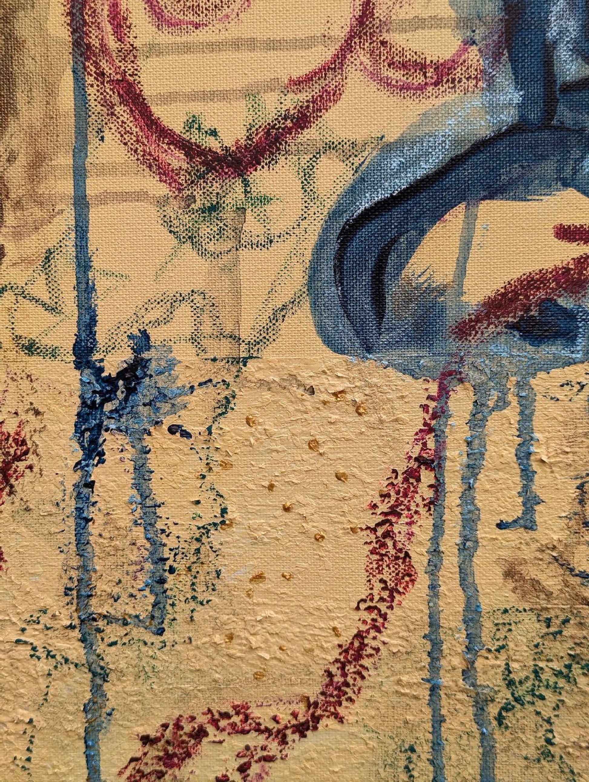 mixed media painting on found canvas (acrylic paint, ink and mediums, tissue paper, glass beads and oil pastel); 2024