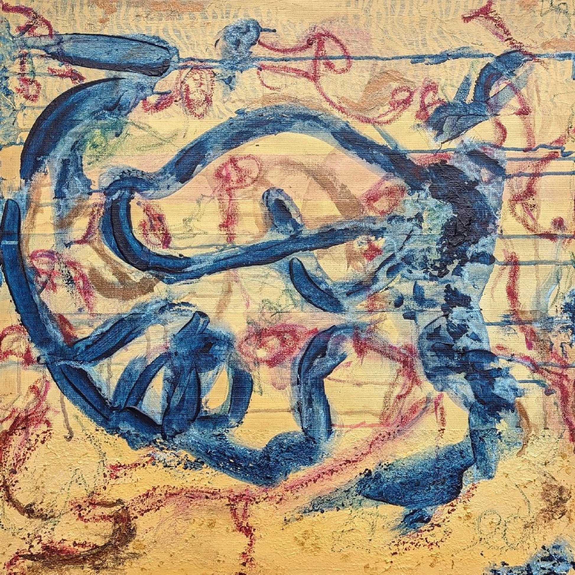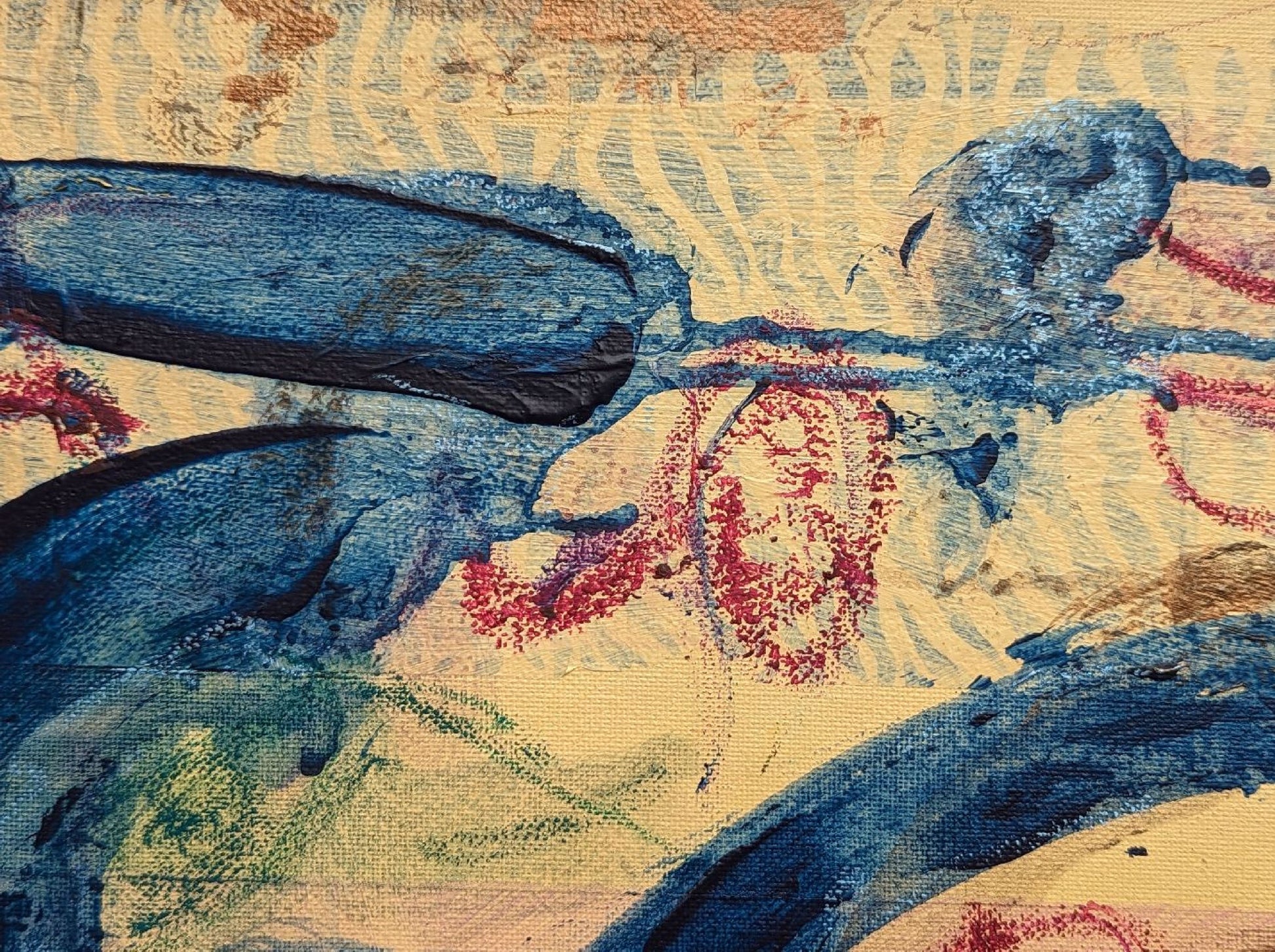 mixed media painting on found canvas (acrylic paint, ink and mediums, tissue paper, glass beads and oil pastel); 2024