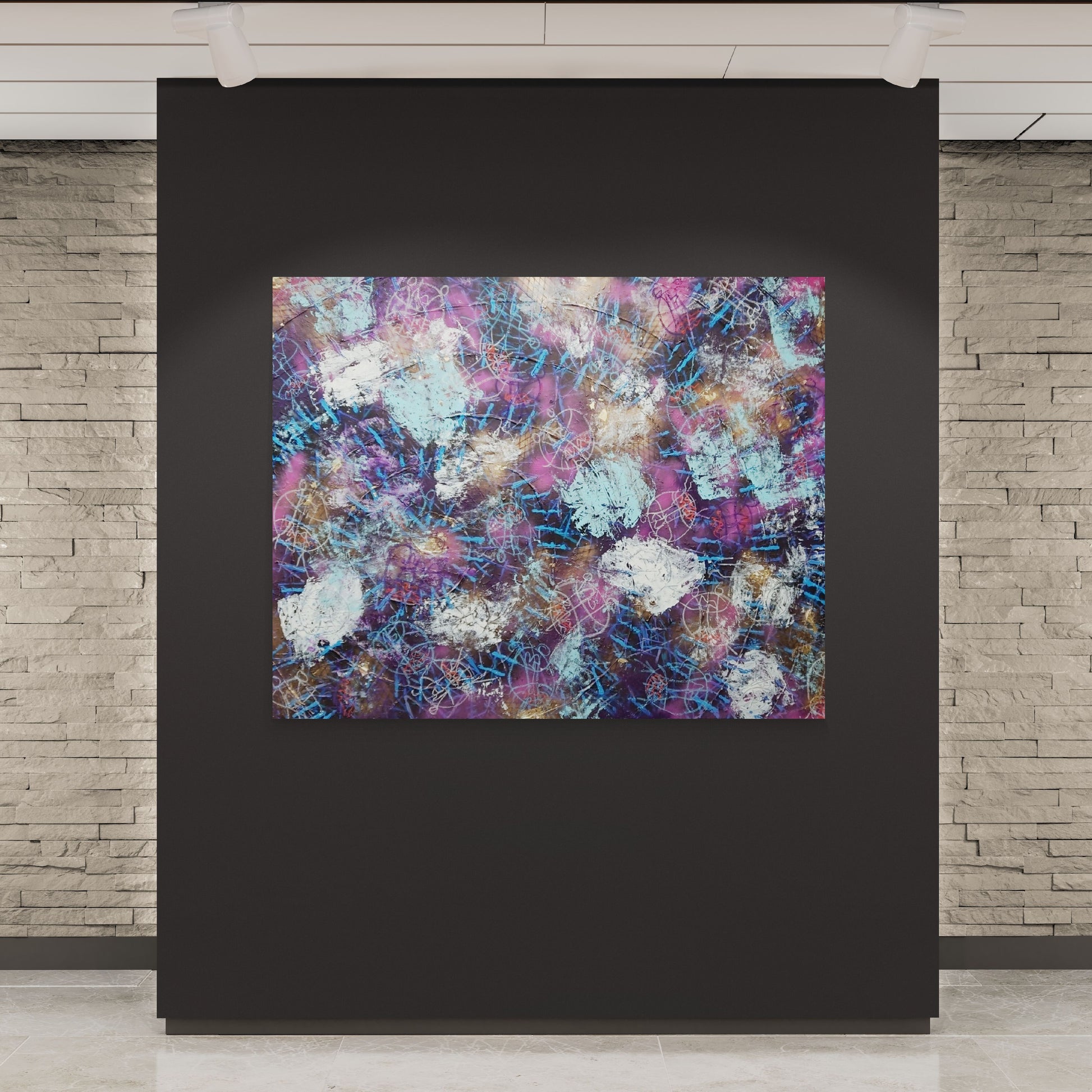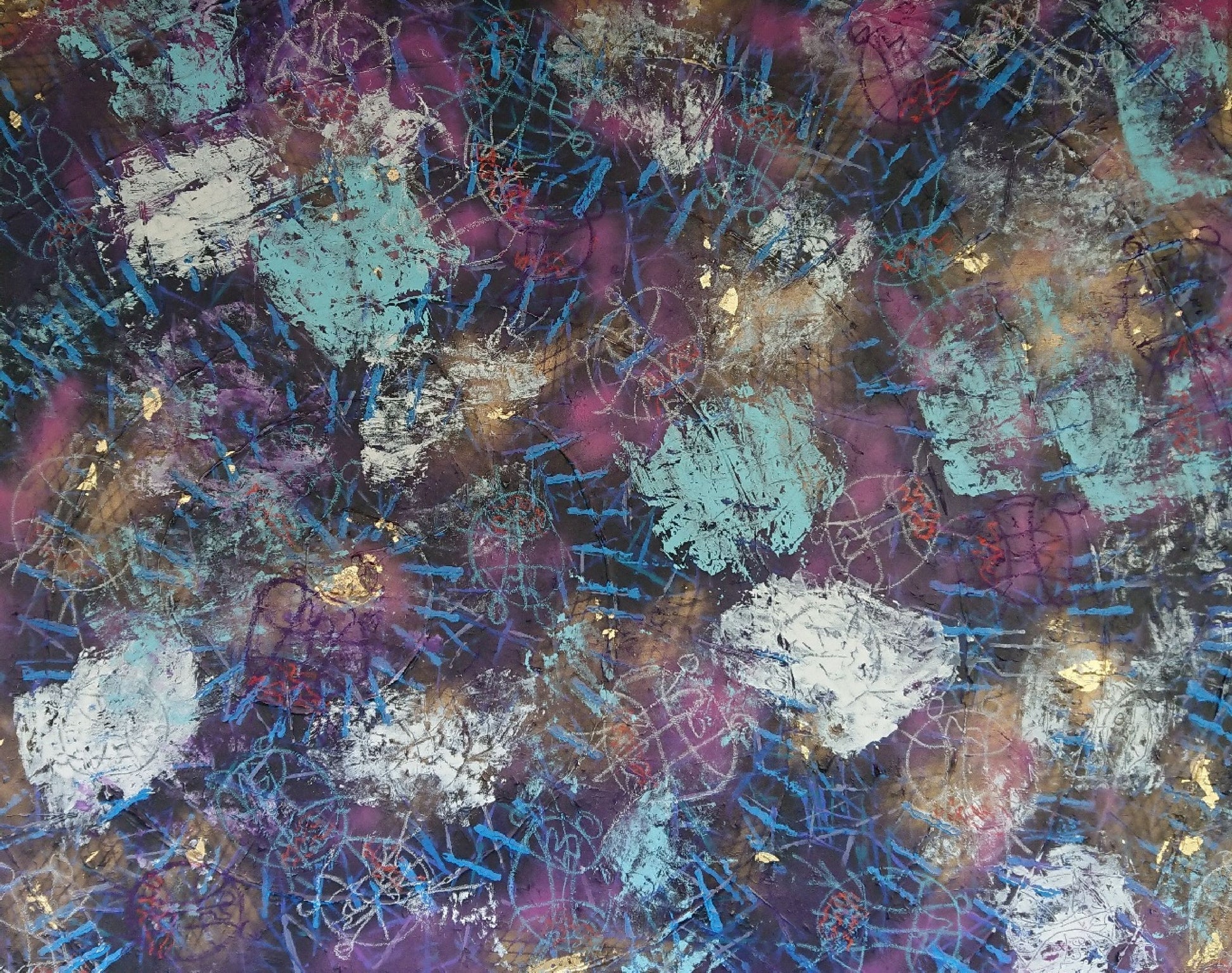mixed media painting on canvas (acrylic paint, modelling paste, gold leaf, oil pastel and re-used materials - yarn); 2020